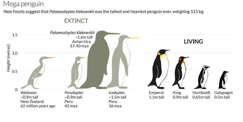 Forget emperor penguins, say hello to the colossus penguin. Newly unearthed fossils have revealed that Antarctica was once home to the biggest species of penguin ever discovered. It was 2 metres long and weighed a hefty 115 kilograms.