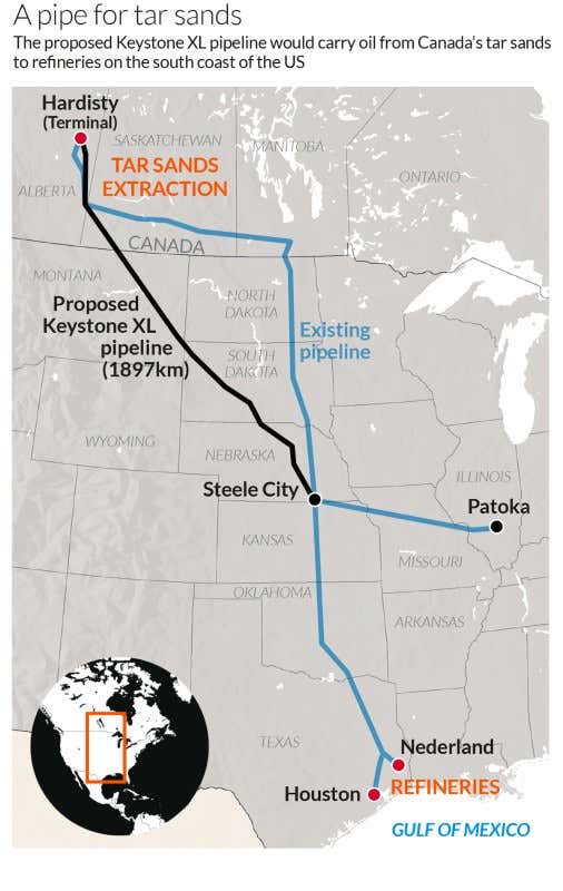 Keystone XL, proposed by the Canadian energy company TransCanada, is intended to run from Alberta, Canada, to Steel City, Nebraska. There it would link to existing pipes, to carry oil from Canada’s tar sands to refineries on the US’s Gulf of Mexico coast.