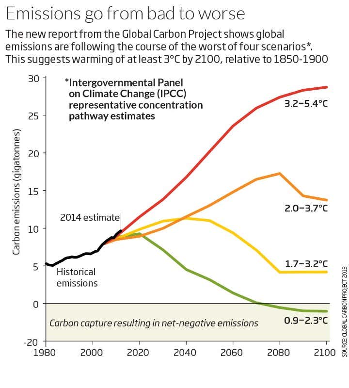 “Our study shows no progress in curbing global carbon emissions,” says Corinne Le Quéré at the University of East Anglia in the UK. Global carbon emissions from fossil fuel burning and cement production grew 2.3 per cent in 2013. They are expected to increase a further 2.5 per cent this year. “And they are projected to be around that for the next five years,” says Le Quéré. “There is no progress in spite of all the talk.”