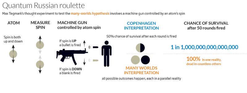 If the multiverse is real, on the other hand, there always will be a universe in which “you” are alive, no matter how long you play. What’s more, you might always end up in it, thanks to the exalted status of the “observer” in quantum mechanics. You would just hear a series of clicks as the gun failed to fire every time – and realise you’re immortal. But be warned: even if you can get hold of a quantum gun, physicists have long argued about how this most decisive of experiments would actually work out.