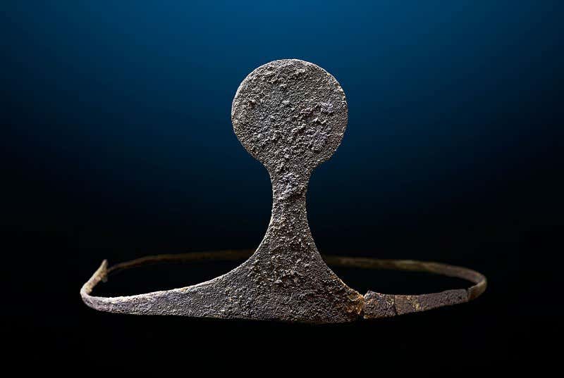 The silver diadem above, which encircled the woman’s skull, is the top prize of the hoard. The tomb also holds unusual gold and silver ear dilators and an elaborate bronze dagger held together with silver nails.