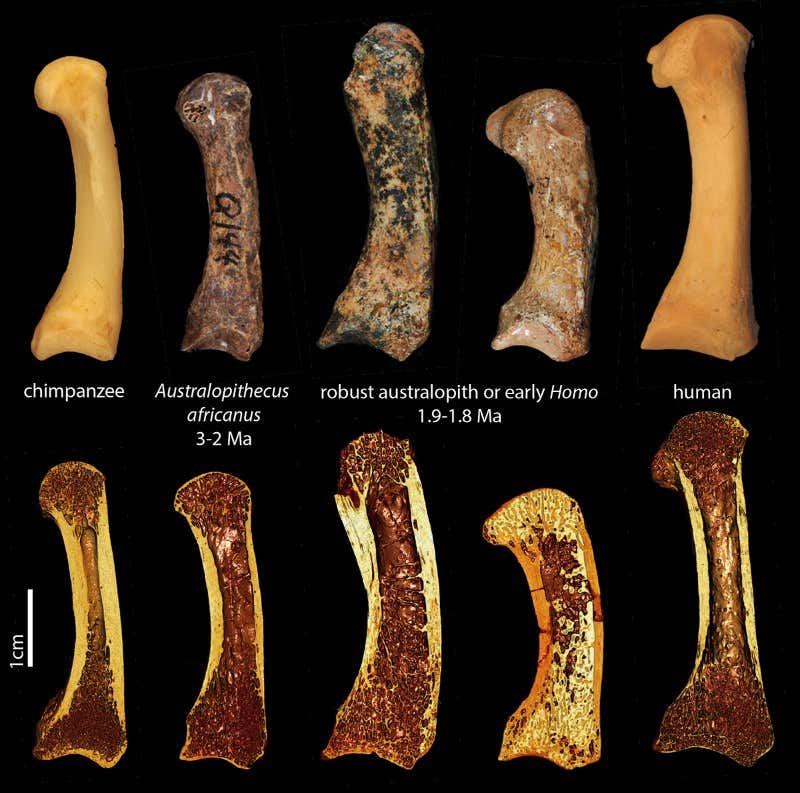 Finally, they looked at metacarpals from four Australopithecus africanus individuals, up to 3 million years old. This revealed that their owners had been tree swingers but had also spent a lot of energy tightly pinching small objects, suggesting they were indeed early tool users.