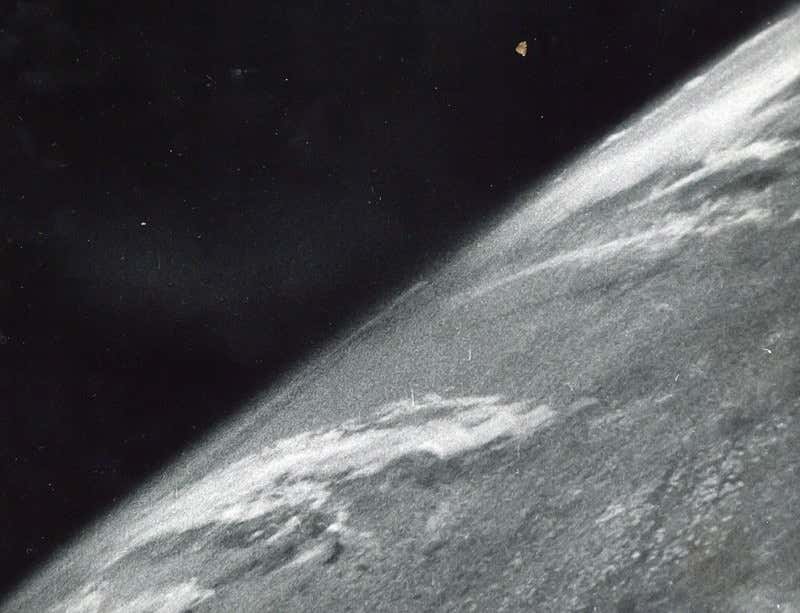 This scratchy image is an original print of the photo, taken in 1946 by a camera in the nose of a V-2 rocket more than 100 kilometres above our planet’s surface. The 35-millimetre negative was retrieved from the remains of the camera after the rocket smashed back to Earth.