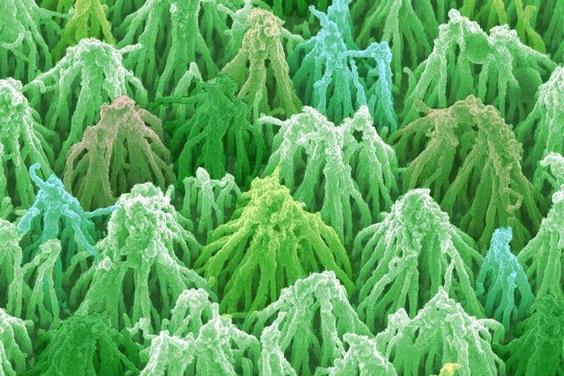 Paul May at the University of Bristol captured the photo with an electron microscope, before adding some colour in Photoshop. It shows what the nanomaterial looks like when wet, after the peaks were coated with a thin layer of diamond to preserve the shape. You can see how the carbon nanotubes, each 50,000 times smaller than a human hair, clump together in pointed, teepee-like clusters – when dry, they stand up straight, like bristles on a brush.