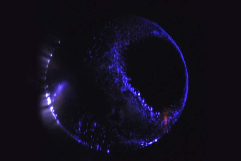 The picture above shows what an aurora might look like across the Red Planet, as created by Jean Lilensten at the Institute of Planetology and Astrophysics in Grenoble, France, and colleagues. They did it using a device called a Planeterrella, which bottles up a sphere, a magnetic field and charged particles. By pumping in the gases in a planet’s atmosphere, they can recreate the corresponding light show.