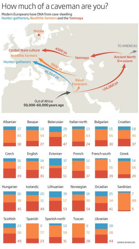 That the DNA of people with modern European ancestry comes from these three groups, and that the mix varies with their origin. People whose families came from Italy and Spain, for instance, have very low amounts of hunter-gatherer DNA; some have none at all. Their DNA is mostly inherited from the Neolithic farmers. Other groups, like those rooted in Norway or Lithuania, get about half of their DNA from the steppe pastoralists.