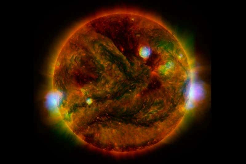 NASA’s Nuclear Spectroscopic Telescope Array, or NuSTAR, captured high-energy X-rays which are present in the most energetic spots, represented in bluish-white. Japan’s Hinode spacecraft picked up low-energy X-rays, depicted in green, while NASA’s Solar Dynamics Observatory imaged areas with extreme ultraviolet light, shown in yellow and red.