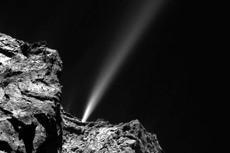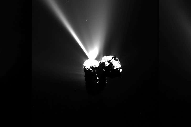 A jet of gas and dust on 29 July, as the comet warmed up ahead of perihelion (Image: ESA/Rosetta/MPS for OSIRIS Team MPS/UPD/LAM/IAA/SSO/INTA/UPM/DASP/IDA)