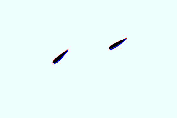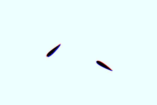 In a second example, the flippers’ combined motion produces only weak vortices and weaker thrust.