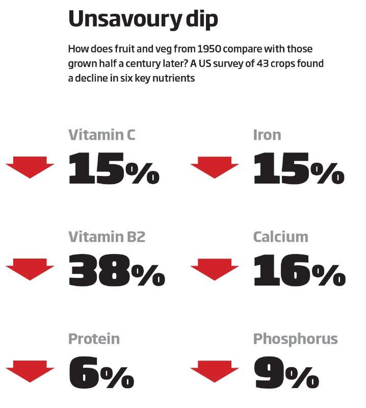 Some of the most eye-catching work in this area has come from Donald Davis, a now-retired biochemist at the University of Texas. In 2011, he compared the nutrients in US crops from 1950 and 2009, and found notable declines in five nutrients in various fruits, including tomatoes, eggplants and squash. For example, there was a 43 per cent drop in iron and a 12 per cent decline in calcium. This was in line with his 1999 study – mainly of vegetables – which found a 15 per cent drop in vitamin C and a 38 per cent fall in vitamin B2 (see table).