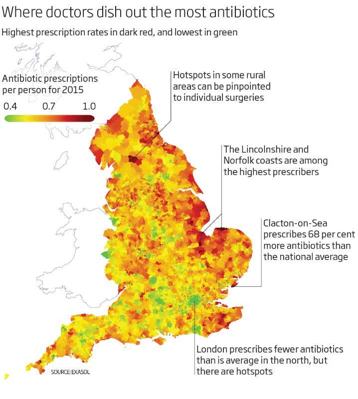 Earlier this year, the National Institute for Health and Care Excellence (NICE) found that of the 40 million antibiotic prescriptions given in the UK last year, 10 million were unnecessary. A NICE spokesperson says the new map reinforces the need for an open and transparent culture for health professionals to discuss local prescribing rates.