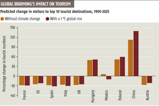Jacqueline Hamilton at the University of Hamburg in Germany and her colleagues modelled the numbers of tourists visiting 207 countries in 2025. Their analysis included the effects of expected population growth and economic development,and local climate changes predicted by the Intergovernmental Panel on Climate Change. The model did not include changing sea levels.