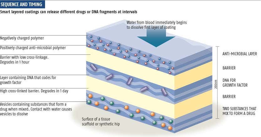The idea has been pursued since 1997, when Gero Decher of Louis Pasteur University in Strasbourg, France, devised a method for depositing very thin polymer films on objects of any shape. The hope was that drugs embedded in these films would be released slowly as the layers broke down in the body. Programmed delivery would simply be a question of varying the thickness of the layers and building in barriers to delay release.