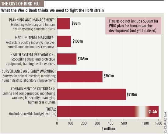 That is what the World Bank would now like to remedy. “If we really move fast now and equip countries to deal with outbreaks quickly, we can keep the costs down,” says John Underwood, head of operations at the World Bank and a member of its flu task force. In November its representatives met counterparts in the World Health Organization (WHO), the FAO and the OIE to devise a global strategy for H5N1, and in late December it posted a detailed analysis of what it will cost to implement it. The bill amounts to $1.4 billion.