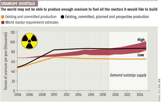 The nuclear industry could deal with this looming uranium shortage by reverting to a technology that was abandoned after considerable investment in both the US and Europe: the fast breeder reactor (FBR). Even as they burn uranium, these reactors make plutonium that can be used as fuel. Only Russia, China, Japan and India are working on FBRs at present. FBRs will soon have to be back on the agenda in the west, nuclear advocates believe. In 30 years they will be commercially viable and in 60 years they will be necessary, Echávarri says. Because they can increase 30-fold the amount of energy extracted from uranium, they are “most attractive from a sustainable point of view”, he argues. Meanwhile, India is investigating reactors that can burn thorium, which is more abundant than uranium.