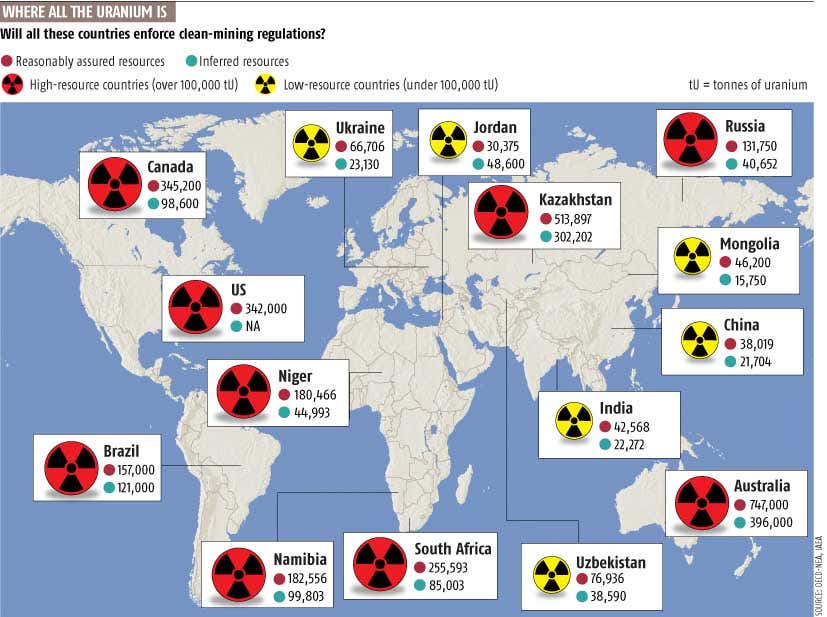 But Hore-Lacy does not have “great confidence” that high standards will be maintained in all countries. “Some countries have great regulations, but if they are not enforced, they are meaningless,” he says. Uranium to help meet the demand for new nuclear power programmes in Asia will come partly from increasing production at existing mines in China, India and Australia, and according to last week’s report from the NEA, a host of new mines are also being planned. The report lists 20 mines scheduled to open before 2030, including one each in Russia, India, Namibia, Niger and Brazil, two in Canada, two in Iran and 11 in Kazakhstan.
