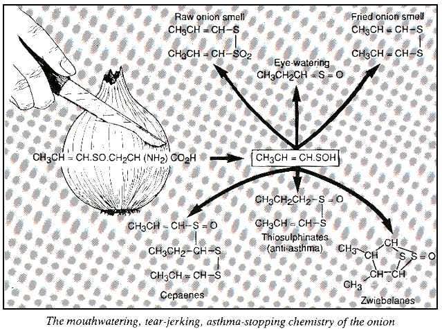 Organic sulphur compounds are notorious for their strong smells, and these are the secret of the onion’s varied aromas. When you slice into an onion, you set off a chain of reactions (see Diagram) that work on propenecysteine sulphoxide, a compound stored in the onion’s tissues.FIG-mg16842701.GIF