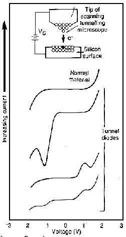 In their experiments, Lyo and Avouris detected a phenomenon called ‘negative differential resistance’, which allows fast switching in some electronic devices (Science, vol 245, p 1369). In normal materials, current flow increases steadily with applied voltage. In tunnel diodes, the current first rises, then falls, then rises again as voltage increases, so a plot of current against voltage has a peak and a valley. The tunnelling currents which Lyo and Avouris measured were appreciable, about a billionth of an ampere, so quantum noise, which is always present, did not interfere with the measurements.
