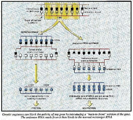 GREENGROCERS could soon be selling genetically engineered tomatoes that stay firm longer. The tomatoes do not produce the enzyme that makes normal ones go soft. Biotechnologists created the new variety through ‘antisense’ technology. This technique, the latest addition to the genetic engineer’s toolbox, is an easy way to switch off particular genes, responsible for making particular enzymesor other proteins. This new artificial ‘off switch’ is now transforming research in fields as different as cancer therapy and plant breeding.