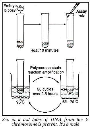 After seven days, the embryos are flushed from the cow’s oviduct or uterus by a technique known as lavage. The technician removes between four and 10 cells from the embryo for sexing. Using an assay technique known as the polymerase chain reaction, a segment of DNA in those cells is replicated continuously over two-and-half hours to make millions of copies. The team has developed a ‘single-tube reaction mix’ that combines the substances used for the test into one formula. If the test then reveals the DNA sequence of the Y chromosome, the embryo is male.