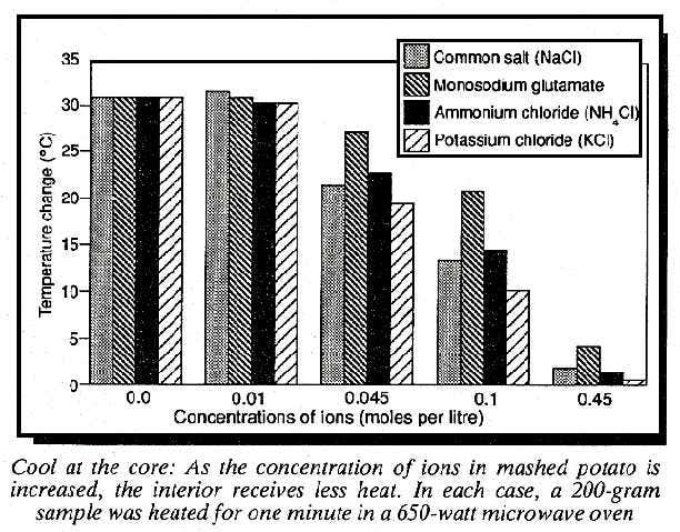 Immediately after heating, Dealler and Lacey measured the ‘core’ temperature of the mashed potato. They found that the samples with the greatest concentration of ions had the coldest interiors (see Figure).
