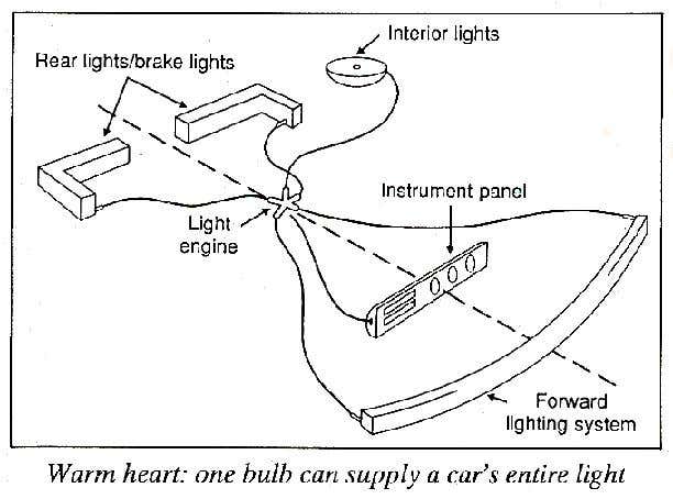 CARS of the future may have all their light from headlamps, indicators, interior lights and so on – supplied by a single powerful bulb. Developed by General Electric in the US, the light from this single lamp would be piped, using optical fibres, to every part of the car. This will provide superior lighting and save power, says the firm. Today’s cars have as many as 80 separate bulbs.