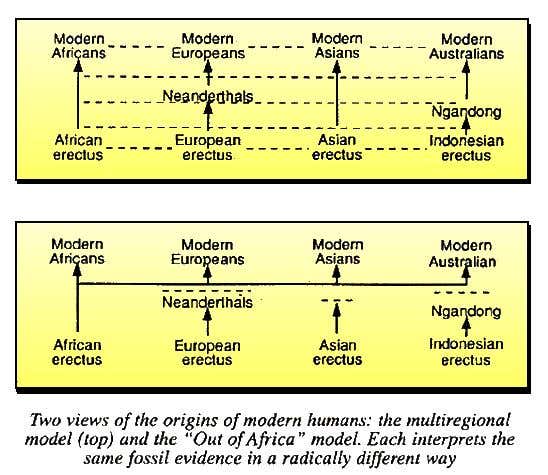 Put simply, one school of thought believes the fossil evidence indicates that modern humans, Homo sapiens, arose relatively recently in Africa. This species then spread throughout the Old World, replacing existing populations of earlier forms of Homo specifically so-called ‘archaic Homo sapiens’, including the Neanderthals. This is known as the Out of Africa hypothesis. According to the second school of thought, modern humans appeared more or less simultaneously in Africa, Europe, and Asia, evolving in situ from an earlier hominid species, Homo erectus, which had migrated from Africa into much of the rest of the Old World about a million years ago. This is known as the multiregional hypothesis.