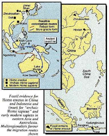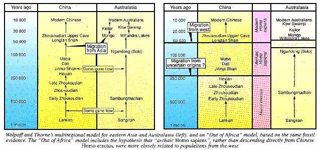 The differences bewtween the two hypotheses are great, both in the evolutionary model for the origin of modern Homo sapiens and in the predictions they make about the nature of the fossil record. For instance, according to the Out of Africa hypothesis, all modern human populations derive from an original African stock. Any anatomical features that might have evolved in different regions of the world in earlier Homo erectus or ‘archaic Homo sapiens’ populations will have been lost. In other words, there will be no specific regional continuity of anatomical characteristics from, say, a million years ago through to the modern world.