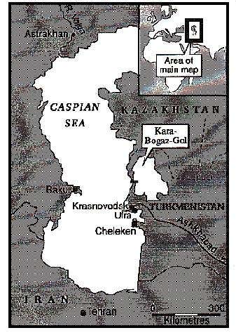 The dam was meant to maintain the level of the Caspian Sea which, by 1976, had fallen to 90 metres below sea level. Hydrologists in Moscow assumed that the loss was due to water starvation caused by the huge irrigation schemes on the Volga and other rivers that feed the sea. They thought that they could compensate for this loss by reducing natural evaporation from the sea. The Kara-Bogaz-Gol, a huge, shallow bay, acts as a giant evaporation pan and is connected to the Caspian only by a narrow strait. Build a dam to isolate the bay and let it dry out, said the experts, and the evaporation from the sea will be greatly reduced.