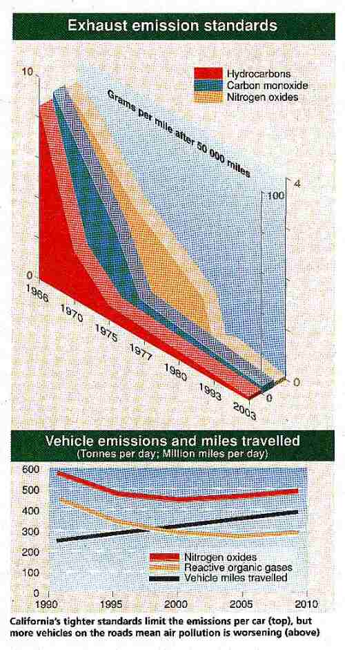 California’s tough emission laws remain the most immediate challenge to the car. They already ensure that new cars in the state emit about one-tenth of the main pollutants – carbon monoxide, hydrocarbons and oxides of nitrogen – that they did in the 1960s. As a result of the standards introduced during the 1970s, catalytic converters and electronic fuel injection systems have become common. Catalytic converters remove pollutants from exhaust gases before they leave the car and electronic fuel injection reduces the volume of pollutants by making combustion more efficient. Europe and the rest of the US followed suit. Now most new cars in the Western world must have catalytic…