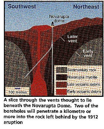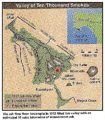 Eighty years ago, 12 cubic metres of molten rock burst from the ground in the wilderness of southwest Alaska. The magma forced its way to the surface, erupting from a new volcanic vent, now called Novarupta, 10 kilometres from Mount Katmai. Gas that had been dissolved in the molten rock expanded and literally blew the volcano apart, filling the air with ash. After two-and-a-half days, when the eruption died down, a layer of ash 30 centimetres thick had fallen on the settlement of Kodiak, 170 kilometres downwind. But closer to the volcano, ash mixed with water and sediments flowed along the ground to form the strangest feature of this eruption – a valley that was, quite literally, steaming. The eruption had filled a broad glacial valley to a depth of 200 metres with hot ash, which covered the damp valley sediments; the moisture gave rise to innumerable smoking vents.