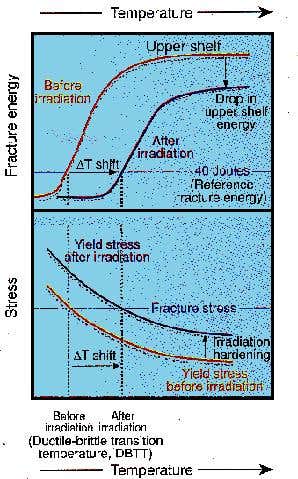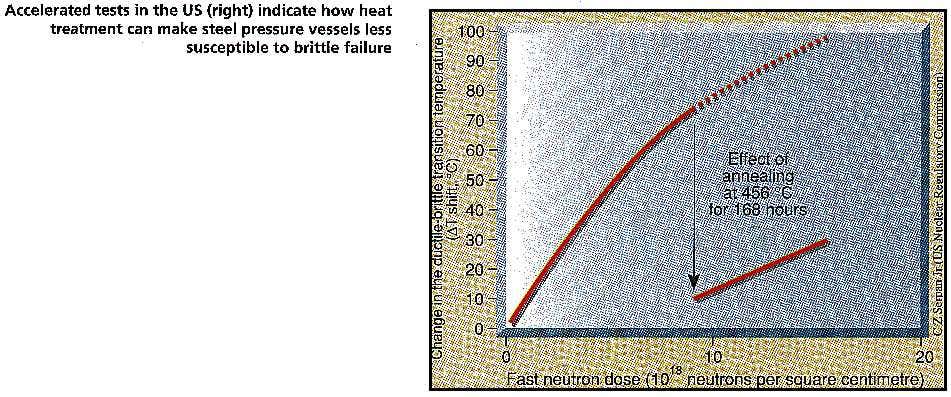 The ageing at Trawsfynydd was mainly the result of long-term exposure to neutron radiation. Nuclear Elec-tric, which regularly assesses the level of neutron damage at its stations by monitoring the condition of samples of construction materials placed in the reactor, decided to shut down the plant’s two reactors to investigate what was happening more thoroughly. As a result, the Nuclear Installations Inspectorate also asked the company to assess the integrity of the pressure vessels in the other four Magnox plants, even though Trawsfynydd’s vessels receive higher neutron doses than the other reactors because of differences in design.