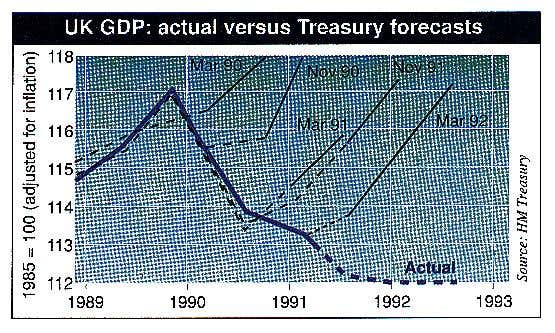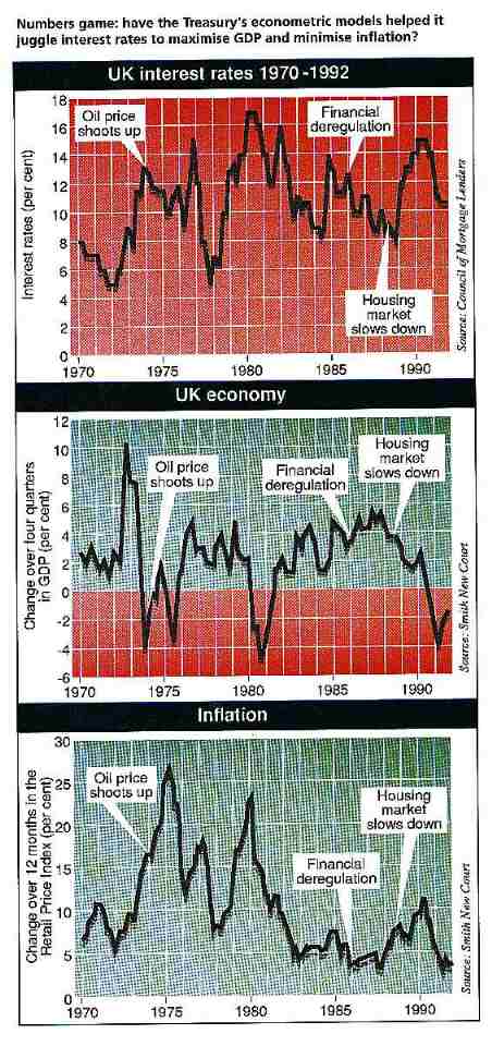 Not all the blame lies with Lamont, however. Often he has simply repeated what the economists of Her Majesty’s Treasury told him. There are 75 of them, more than 20 directly involved in the forecasting process. On the fourth floor of the Treasury’s gloomy Whitehall home lurks an IBM 4381 mainframe which runs one of the most sophisticated computer models of the economy in Britain. It was first developed in 1968, though its results were kept secret even from the Cabinet until 1977. Then an Act of Parliament forced it into the open.