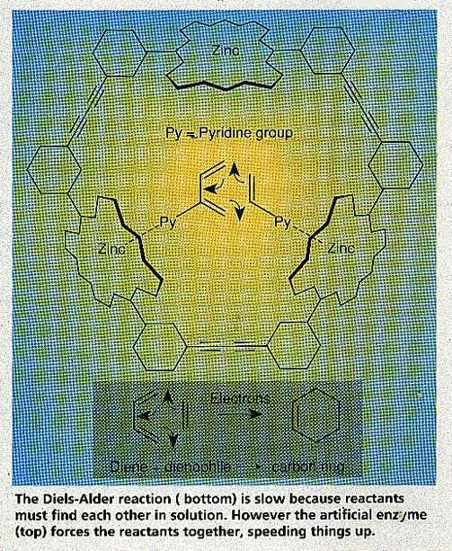 Jeremy Sanders and his colleagues at the University of Cambridge have designed and synthesised a large cyclic ‘receptor’ molecule, which makes one such reaction proceed almost 6000 times as fast as usual. The receptor is similar to another built last year by the same team (New Scientist, Science, 1 February 1992). It consists of a ring of three porphyrin molecules linked by bridging chemical groups. Each porphyrin molecule contains a zinc ion at its centre. The central cavity of the new receptor is slightly smaller than before, and the researchers have also anchored pyridine groups to two of the zinc ions to act as bonding sites (see Diagram).FIG-mg18672701.GIF