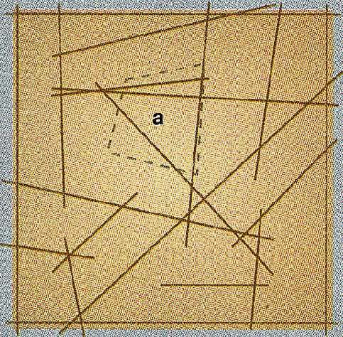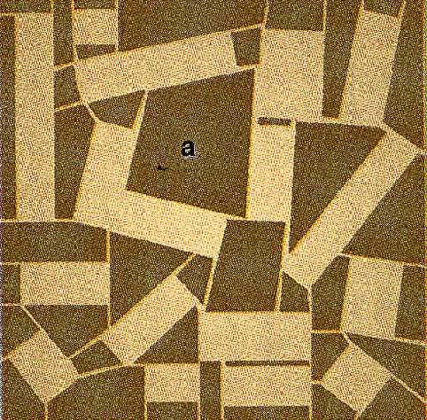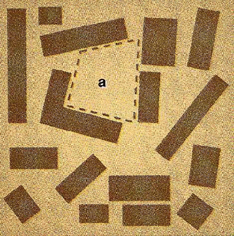In a hypothetical layout of a settlement (above, left), the black figures represent buildings and the white areas represent space used, for example, for roads, public squares and walkways. Area (a) is one of the convex segments used to describe this space.FIG-mg18714101.jpg