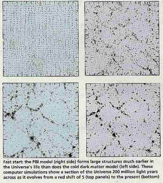 The computer simulations indicate that the PBI model forms galaxies, clusters and superclusters much faster than does the cold dark matter model (see Figure). Cen and his colleagues also find that the PBI model gives galaxy clusters whose masses are similar to those observed in the real Universe. By contrast, the clusters that emerge from the cold dark matter model are too massive. Also, in the cold dark matter model, galaxies have velocities relative to galaxies near them that are too high, whereas the PBI model produces velocities that match observations.