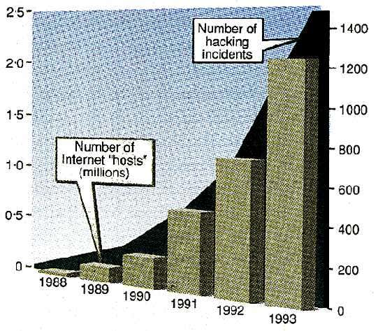 The Internet has 20 million users – 45 per cent of them outside the US – and is adding new users at the rate of 15 to 20 per cent a month. Illicit use of the Internet is also rising (see Graph). During 1993, the US government’s Computer Emergency Response Team Coordination Center at Carnegie Mellon University in Pittsburgh received reports of 1334 security breaches. Presumably, some incidents were harmless break-ins by students. But the FBI estimates that in 80 to 90 per cent of the computer crimes it is investigating, the criminals used the Internet to gain access to computers. In many cases, gaps in security could be closed easily, says Dain Gary of the response team. But computer managers are often too busy, or too complacent, to make the improvements. They also worry that tighter security will be costly or will make computers more difficult to use.