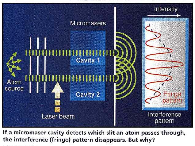 But now it seems that things are not that simple. Pippa Storey and colleagues at the University of Auckland have shown that even in this kind of idealised experiment, the presence of the cavities disturbs the atoms in just the right way to ‘wash out’ the interference pattern, and it is this that makes the pattern disappear. In their paper in Nature (vol 367 p 626) they point out that although the ejection of a photon by the excited atom need not affect its forward momentum through the slit(s), there is always some uncertainty in the amount of sideways momentum imparted to the atom by the kick of the departing photon.