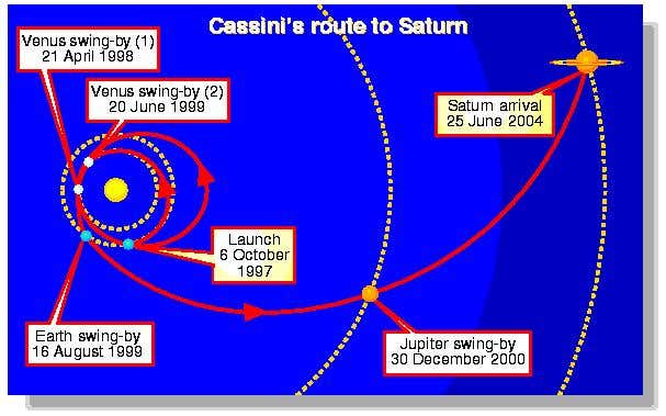 Once in interplanetary space, Cassini will fly a complex trajectory, in which it will slingshot past Venus twice, then past Earth, in order to pick up enough speed for the trip to Saturn (see Diagram).FIG-mg19490901.jpg