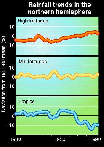 Using these corrected figures, he has found that there has been a marked decline in rainfall in the northern hemisphere tropics, south of 23.4° North. At mid-latitudes – between 23.4° North and 50° North – there has been very little change. But north of 50° North – about the latitude of the south coast of England – rainfall has increased (Weather, vol 50, p 34). Unfortunately, the data for the southern hemisphere are too sparse to break down into latitude bands.