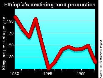 The country’s tragedy is that that the amount of food produced per head of population is in long-term decline. It was higher in 1984, the year when the great drought began, than in any year since (see Diagram). Many famines, are “inherently unpredictable”, being caused as much by war as shortage of food, says Peter Walker of the International Red Cross in Geneva. But the problem is not just predicting disasters. People, especially governments, have to act on the warnings.