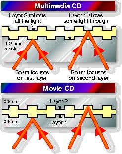 The sandwich design also stopped the original SD player from playing ordinary CDs. This is because the transparent layer over the top of any CD track plays an important role in focusing the player’s laser. In the original SD player the laser focused through one of two layers 0.6 millimetres thick. A normal CD is 1.2 millimetres thick, and a simple lens cannot cope with both thicknesses. The rival MCD discs are the same thickness as ordinary CDs, so an MCD player can focus on either high-density MCDs or ordinary CDs.