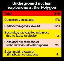 The new study on the environmental impact of previous Soviet underground nuclear tests was carried out by six scientists from Russian and Kazakh research centres. According to Anatoly Matushchenko from the Russian State Institute for Applied Ecology, who led the study, of the 348 underground explosions at the Polygon between 1961 and 1989, 76 were “completely contained” (see Table). By this the researchers mean that “only xenon, krypton and hydrogen traces can be detected in the atmosphere”.