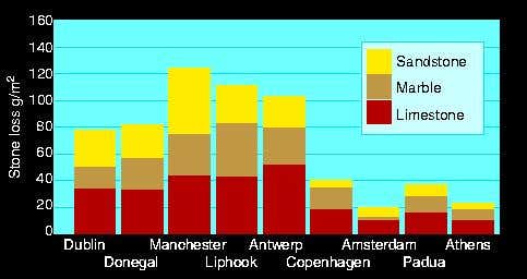 Other large cities, such as Athens, Copenhagen and Amsterdam, had rates of stone loss only a fraction of those at the British sites. Donegal, a county in northwest Ireland, suffered badly because of intensely heavy rainfall, say the researchers (see Graph).