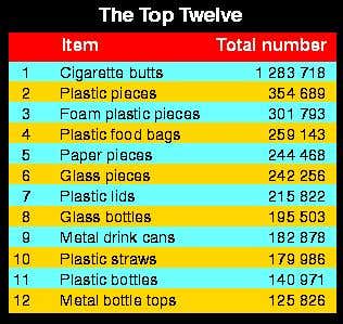 The centre reported one bright spot: cruise ships appear to be dumping less rubbish over the side than in the past. Volunteers found only three piles of rubbish that could be traced to a cruise ship – including plastic sweet wrappers and a swizzle stick bearing the logo of Norwegian Cruise Lines (see Table).