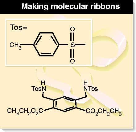The building block used to make the ribbons is a benzene ring with two pairs of chemical arms (see Figure). On one side, the arms consist of a nitrogen atom joined to a hydrogen atom and a tosyl group (Tos), which itself contains a benzene ring. On the other side, the arms are ethyl esters.