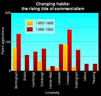 Andrew Webster and Kathryn Packer of Anglia polytechnic University in Cambridge counted Britain’s patents from painstaking literature searches and questionnaires returned by 31 of Britain’s 62 “old” universities. They also conducted in-depth interviews to find out how universities manage the patenting process. Of the 31 universities – which include those with the biggest incomes from royalties – only 12 said that their patenting departments broke even, 10 had no policy for handling intellectual property, and only half a dozen had royalty earnings in excess of £1 million a year.