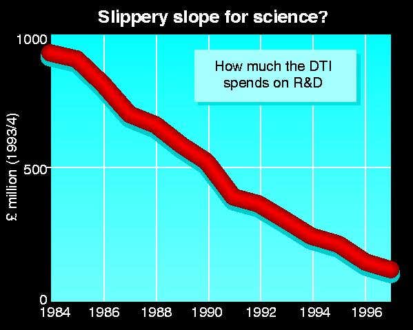 The DTI’s record is not reassuring. Over the past ten years, it has cut its spending on R&D dramatically (see Diagram), and several of its research laboratories have been targeted for privatisation. This is ringing alarm bells about the future of research council institutions such as the Laboratory of Molecular Biology in Cambridge. The fear is that they could be up for sale before long. The DTI’s chief scientist, Geoffrey Robinson, who came to the job from IBM, was replaced by a civil servant from within the department. This has led to speculation that when John Cadogan retires as director-general of the research councils, a DTI insider will replace him.