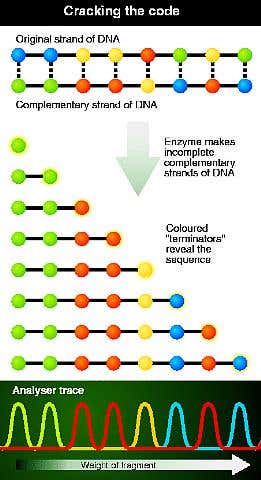 The researchers then unzip the complementary fragments from the original strands by heating them up. They separate all the fragments by weight, and identify the terminator base on each one. The most common way to do this is to attach a different dye to each of the four types of terminator. Every fragment of a certain length is then “colour-coded” depending on whether its terminal base is guanine, cytosine, adenine or thymine.