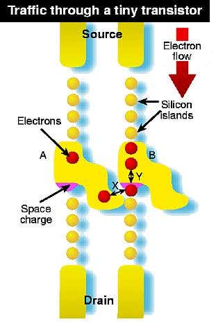 The electrons on A impede the progress of electrons beyond B by repelling them. Normally, the effect of this force (X) would be limited because other electrons on B would exert an even stronger repulsive force (Y). But Ahmed and Nakazato create a “space charge” by permanently removing electrons from a region of B. The resulting weak positive charge is enough to screen the repulsive forces between electrons on B. A single electron on A can hold as many as three electrons in place on B.